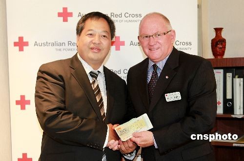 2009年2月19日,西澳福建同鄉(xiāng)會潘邦照會長代表西澳華人向澳大利亞紅十字會交接澳洲華人社區(qū)為澳大利亞維多利亞火災(zāi)募集的第一筆捐款共四萬七千七百七十七澳幣(折人民幣22萬元)。澳大利亞紅十字會執(zhí)行理事Steve Joske代表紅十字會接受捐款并對澳洲華人們的善舉給予高度贊揚(yáng)。中新社發(fā) 高周丹 攝