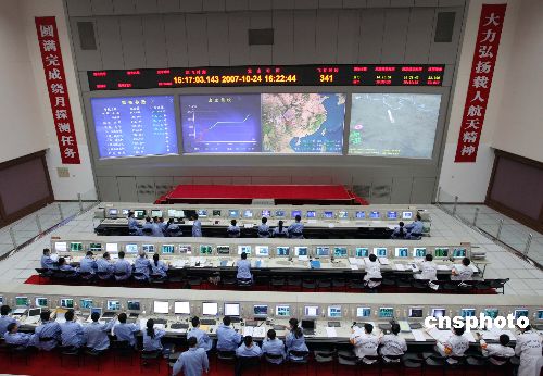 十月二十四日下午,北京航天飛行控制中心工作人員在做嫦娥一號衛(wèi)星發(fā)射前的最后準備。中國首顆月球探測衛(wèi)星——嫦娥一號發(fā)射工作已經(jīng)準備就緒,計劃于當日十八點零五分發(fā)射。中新社發(fā) 毛建軍 攝