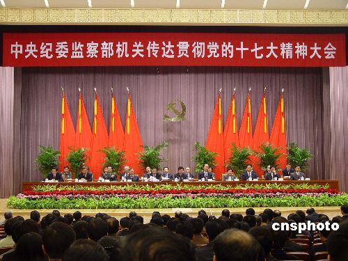 十月二十四日上午,新任中共中央政治局常委、中央紀(jì)委書記賀國強(qiáng)出現(xiàn)在中紀(jì)委機(jī)關(guān)大禮堂,與中央紀(jì)委監(jiān)察部機(jī)關(guān)的黨員干部見面。中共中央紀(jì)委監(jiān)察部當(dāng)日召開機(jī)關(guān)全體黨員干部大會(huì),傳達(dá)學(xué)習(xí)黨的第十七次全國代表大會(huì)精神,賀國強(qiáng)出席會(huì)議并講話。中新社發(fā) 孫宇挺 攝