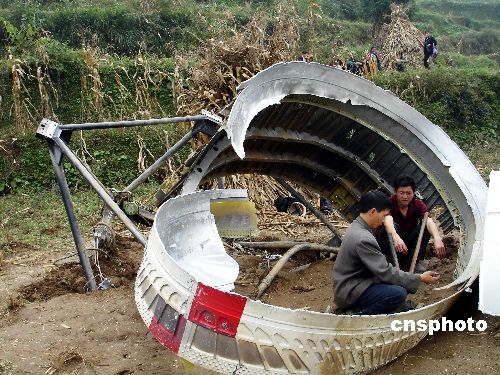 10月24日18時(shí)05分,在西昌衛(wèi)星發(fā)射中心發(fā)射的“嫦娥一號(hào)”衛(wèi)星,任務(wù)代號(hào)“07——34”,一級(jí)火箭殘骸成功著落于貴州福泉道坪鎮(zhèn)上平果村民組。殘骸 外殼著落于該村民組玉米地面,殘骸著落于一吳姓村民房屋中梁,全村民無(wú)人受傷。目前相關(guān)部門(mén)正在組織人員拆卸回收。中新社發(fā) 易勝武 攝