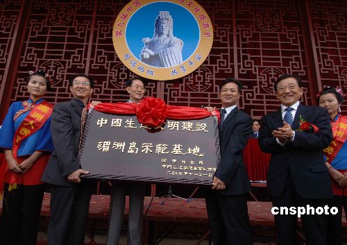 11月1日,中共中央委員、國家林業(yè)局局長賈治邦(右二)、中國生態(tài)道德教育促進會理事長陳壽朋(左三)在第九屆中國.湄州媽祖文化旅游節(jié)開幕式上共同為中國第一個生態(tài)文明建設示范基地——福建莆田湄洲島基地授牌。當天,媽祖故鄉(xiāng)福建莆田湄洲島成立了中國第一個生態(tài)文明建設示范基地。中新社發(fā) 劉可耕 攝