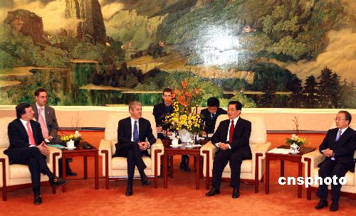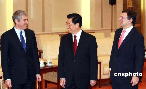 十一月二十八日,北京人民大會(huì)堂,中國(guó)國(guó)家主席胡錦濤會(huì)見歐盟輪值主席國(guó)葡萄牙總理蘇格拉底與歐盟委員會(huì)主席巴羅佐。他們是前來參加第四屆中歐工商峰會(huì)的。中新社發(fā) 廖文靜 攝