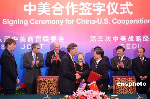 十二月十一日,中美雙方在北京釣魚臺國賓館舉行中美合作簽字儀式,中國國務(wù)院副總理吳儀、美國財(cái)政部長鮑爾森、商務(wù)部長古鐵雷斯等出席簽字儀式。中新社發(fā) 毛建軍 攝
