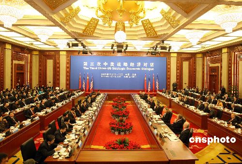 十二月十二日,第三次中美戰(zhàn)略經(jīng)濟(jì)對(duì)話在北京中信國(guó)安第一城開(kāi)幕,胡錦濤主席特別代表、國(guó)務(wù)院副總理吳儀致辭。中新社發(fā) 毛建軍 攝