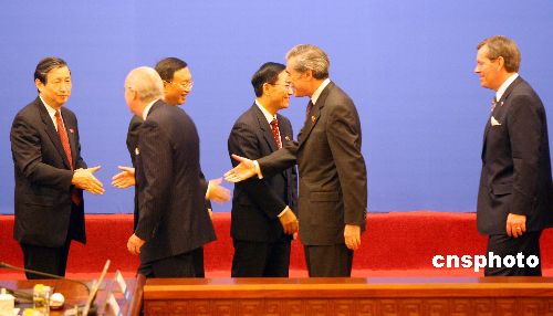 十二月十二日,第三次中美戰(zhàn)略經(jīng)濟(jì)對話在北京中信國安第一城開幕。出席會議的中方代表謝旭人(財政部長)、楊潔篪(外交部長)、馬凱(國家發(fā)改委主任)等(從右至左),與美方代表雷德(美國駐華大使)、古鐵雷斯(商務(wù)部長)(從左至右)等握手寒暄。中新社發(fā) 毛建軍 攝