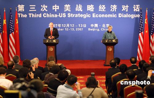 十二月十三日,第三次中美戰(zhàn)略經濟對話在北京閉幕,中國國務院副總理吳儀與美國財長保爾森共同會見記者。中新社發(fā) 毛建軍 攝