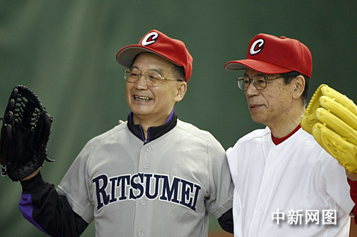 十二月二十九日,中國國務(wù)院總理溫家寶與日本首相福田康夫在北京釣魚臺國賓館內(nèi)的網(wǎng)球館共同練習(xí)棒球投球。作者:盛佳鵬