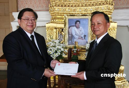 一月三日,中國(guó)國(guó)家主席胡錦濤向泰國(guó)國(guó)王普密蓬發(fā)來(lái)唁電,對(duì)泰國(guó)王姐甘拉亞妮·瓦塔娜逝世表示哀悼。當(dāng)日上午,中國(guó)駐泰大使張九桓(右)通過(guò)泰國(guó)外交部轉(zhuǎn)交這份唁電。中新社發(fā) 顧時(shí)宏 攝