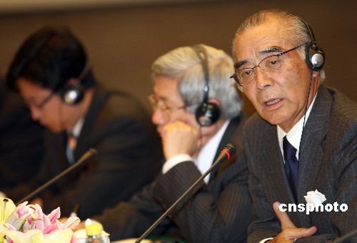 日方首席委員小林陽太郎(右)在閉幕式上發(fā)言。