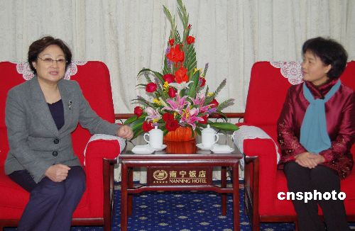 2月2日晚,在僑鄉(xiāng)廣西遭遇嚴(yán)重雨雪冰凍災(zāi)害急需援助之際,中國國務(wù)院僑辦主任李海峰女士(左)一行從北京飛赴南寧進(jìn)行慰問,并與廣西自治區(qū)人大常委會副主任、廣西紅十字會會長劉新文進(jìn)行會談,隨后李海峰代表國務(wù)院僑辦和海外僑胞向廣西災(zāi)區(qū)民眾捐助一百萬元人民幣。中新社發(fā) 劉萬強(qiáng) 攝