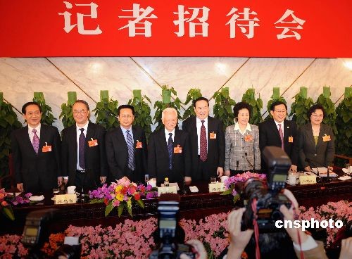 三月六日下午,全國政協(xié)十一屆一次會議記者招待會在北京人民大會堂新聞發(fā)布廳舉行,主題是“民主黨派中央主席談多黨合作”。九三學(xué)社中央主席韓啟德、農(nóng)工黨中央主席桑國衛(wèi)、民建中央主席陳昌智、民革中央主席周鐵農(nóng)、民盟中央主席蔣樹聲、民進中央主席嚴(yán)雋琪、致公黨中央主席萬鋼、臺盟中央主席林文漪(從左至右)共同亮相,受到中外媒體的熱烈關(guān)注。中新社發(fā) 廖攀 攝