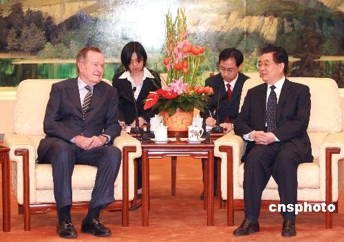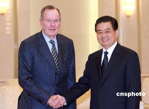 三月七日,中國國家主席胡錦濤在北京人民大會堂會見美國前總統(tǒng)喬治·布什。中新社發(fā) 廖文靜 攝