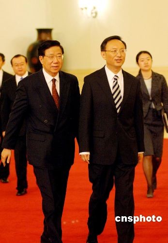 圖為楊潔篪(前右)、姜恩柱(前左)等步入記者會(huì)現(xiàn)場。