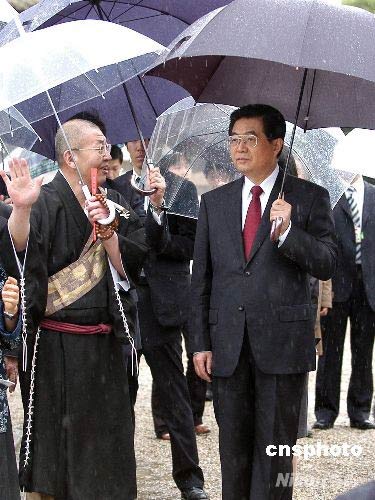 正在日本進(jìn)行國(guó)事訪問的中國(guó)國(guó)家主席胡錦濤,十日冒雨參觀位于奈良的法隆寺。法隆寺是日本佛教圣德宗的總寺廟,寺內(nèi)供奉有百濟(jì)觀音等大量國(guó)寶級(jí)文物,是日本佛教文化寶庫(kù)。中新社發(fā) 齊彬 攝