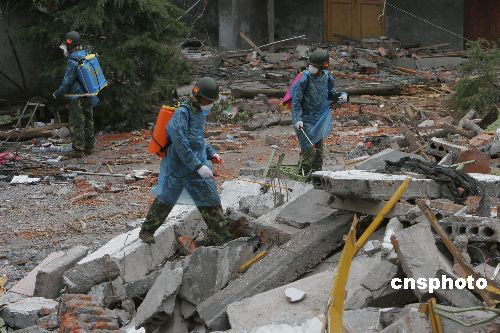 圖:防疫隊對地震的重災(zāi)區(qū)紅白鎮(zhèn)進(jìn)行防疫工作