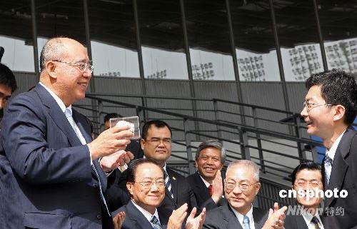 5月28日,中國國民黨主席吳伯雄一行前往北京奧運場館之一的五棵松棒球場進行參觀。吳伯雄現(xiàn)場獲贈球場比賽開出的第一枚棒球作為紀念。中新社發(fā) 盛佳鵬 攝