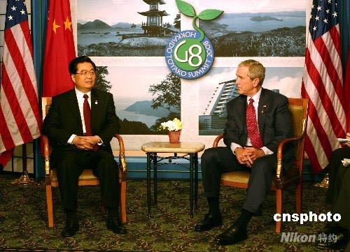 正在日本北海道出席八國集團(tuán)同發(fā)展中國家領(lǐng)導(dǎo)人對話會的中國國家主席胡錦濤,當(dāng)?shù)貢r(shí)間7月9日下午會見美國總統(tǒng)布什,雙方就中美關(guān)系和其他共同關(guān)心的問題深入交換了意見。布什還表示,希望得到美國和中國的奧運(yùn)會籃球比賽的門票。他笑著對胡錦濤說:“如果您能幫我搞到票的話,我將非常感激! 中新社發(fā) 張朔 攝