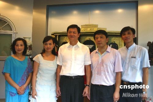 7月26日下午,臺北縣長周錫瑋一行參觀南京“總統(tǒng)府”(南京中國近代史遺址博物館),并在“總統(tǒng)府”巨幅彩照前和館內工作人員合影。臺北縣南京參訪團于25日晚間抵達南京,展開訪問。中新社發(fā) 朱曉穎 攝