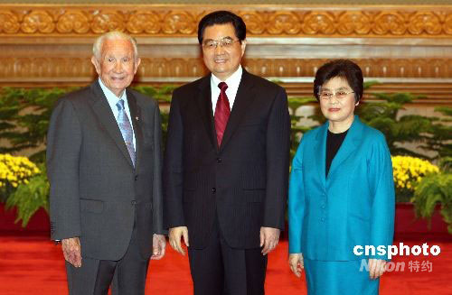 九月六日,中國國家主席胡錦濤和夫人劉永清在北京人民大會(huì)堂歡迎出席2008年殘奧會(huì)的各國貴賓。圖為胡錦濤夫婦與國際奧委會(huì)名譽(yù)主席薩馬蘭奇先生合影。中新社發(fā) 任海霞 攝