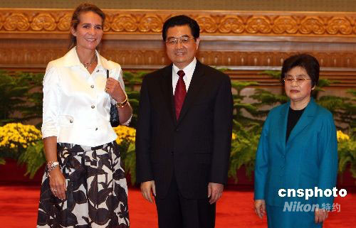 九月六日,國家主席胡錦濤夫婦在北京人民大會(huì)堂歡迎出席2008年殘奧會(huì)的各國貴賓。圖為胡錦濤夫婦歡迎西班牙公主愛萊娜。中新社發(fā) 任海霞 攝