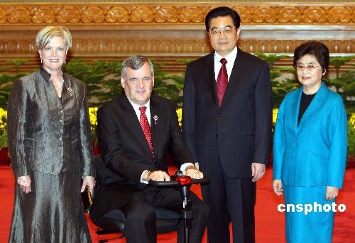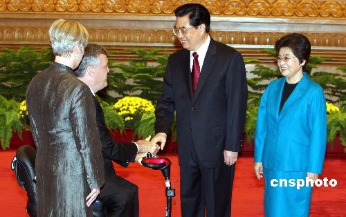 九月六日,國家主席胡錦濤夫婦在北京人民大會堂歡迎出席2008年殘奧會的各國貴賓。圖為胡錦濤夫婦歡迎加拿大安大略省省督戴維·C·翁利。中新社發(fā) 任海霞 攝