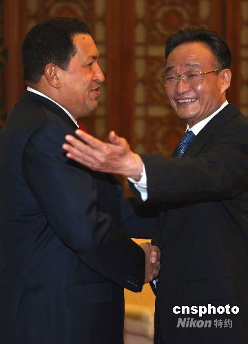 9月24日下午,中國(guó)全國(guó)人大常委會(huì)委員長(zhǎng)吳邦國(guó)在北京人民大會(huì)堂會(huì)見來(lái)訪的委內(nèi)瑞拉總統(tǒng)查韋斯。中新社發(fā) 任晨鳴 攝