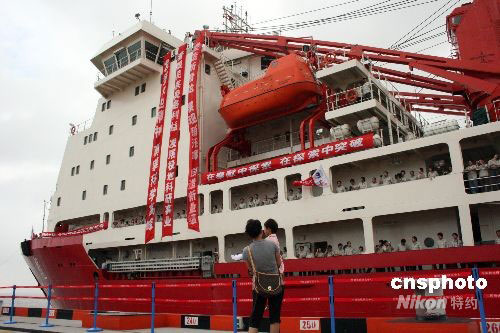 九月二十四日,搭乘著中國第三次北極科考隊(duì)的“雪龍”號極地破冰船凱旋“回家”,停泊在上海浦東外高橋碼頭。此次出征歷時兩個多月,航程超過萬余海里。中新社發(fā) 陸從兵 攝