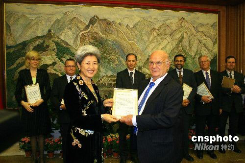 當?shù)貢r間9月25日晚,中國駐英使館舉行國慶59周年招待會。圖為中國駐英大使傅瑩(左)在招待會上向英外交部、國際發(fā)展部、英中貿(mào)協(xié)等機構(gòu)代表及個人頒發(fā)中國民政部四川地震捐贈證書。中新社發(fā) 李鵬 攝