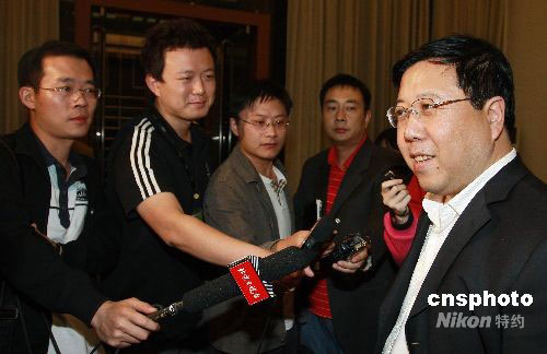 “長(zhǎng)征二號(hào)F”運(yùn)載火箭總設(shè)計(jì)師荊木春在機(jī)場(chǎng)接待廳被記者追蹤采訪。