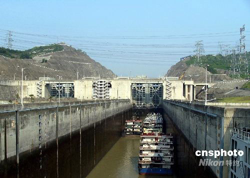據(jù)長(zhǎng)江三峽通航管理局消息,2008年10月3日下午,長(zhǎng)江三峽雙線五級(jí)船閘由四級(jí)運(yùn)行正式轉(zhuǎn)入五級(jí)運(yùn)行。三峽工程自9月28日零時(shí)開始試驗(yàn)性蓄水,水位從145米逐日抬升,截至10月4日15時(shí)已上升至154.25米。按照三峽船閘設(shè)計(jì)要求,三峽船閘在上游水位超過152.4米時(shí),將由四級(jí)運(yùn)行轉(zhuǎn)換為五級(jí)補(bǔ)水運(yùn)行,同時(shí),在152.4米到156米以下水位時(shí)仍可執(zhí)行四級(jí)運(yùn)行方式。三峽雙線五級(jí)船閘自2003年6月16日試通航,5年多來一直采用四級(jí)運(yùn)行的方式。中新社發(fā) 劉君鳳 攝