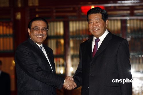 10月16日,中國(guó)全國(guó)政協(xié)主席賈慶林在北京釣魚臺(tái)國(guó)賓館會(huì)見巴基斯坦總統(tǒng)扎爾達(dá)里。中新社發(fā) 盛佳鵬 攝