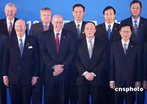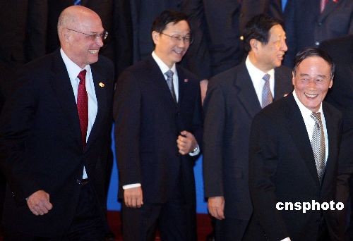 12月5日上午,第五次中美戰(zhàn)略經(jīng)濟(jì)對(duì)話(huà)在北京釣魚(yú)臺(tái)國(guó)賓館閉幕前,中國(guó)國(guó)務(wù)院副總理王岐山和美國(guó)財(cái)政部部長(zhǎng)保爾森以及雙方與會(huì)人員合影留念。中美戰(zhàn)略經(jīng)濟(jì)對(duì)話(huà)是2006年9月由中國(guó)國(guó)家主席胡錦濤和美國(guó)總統(tǒng)布什發(fā)起設(shè)立的,是中美現(xiàn)有20多個(gè)磋商機(jī)制中級(jí)別最高的一個(gè)。對(duì)話(huà)每年兩次,輪流在中美舉行。中新社發(fā) 任晨鳴 攝