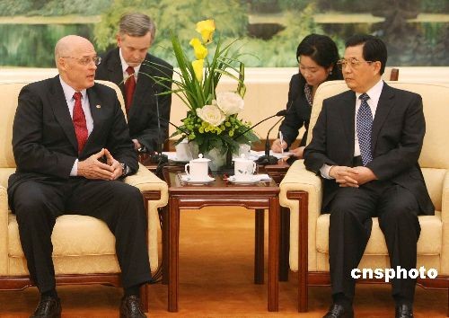 12月5日下午,中國國家主席胡錦濤在北京人民大會堂會見出席第五次中美戰(zhàn)略經(jīng)濟對話的美國代表團時,與美國財政部長保爾森交談。中新社發(fā) 任晨鳴 攝