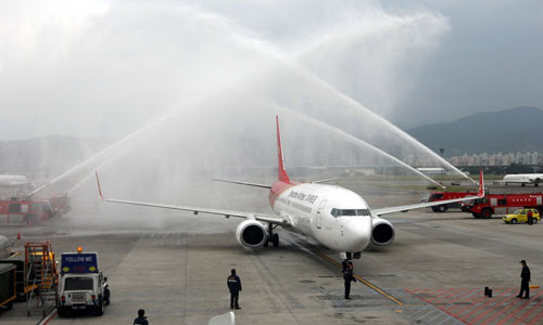 2008年12月15日,深圳航空首航臺(tái)灣的第一班平日包機(jī)在臺(tái)北松山機(jī)場降落。松山機(jī)場方面以噴水方式表示歡迎。兩岸常態(tài)包機(jī)直航從此開始營運(yùn)。(“中央社”圖)