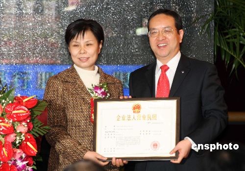 國家工商行政管理總局企業(yè)注冊局局長郭志斌(左)向國家開發(fā)銀行行長蔣超良頒發(fā)《營業(yè)執(zhí)照》。