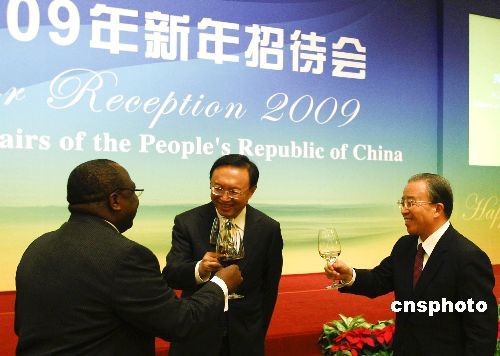 12月28日,中國(guó)外交部部長(zhǎng)楊潔篪在北京釣魚(yú)臺(tái)國(guó)賓館舉行“外交部2009年新年招待會(huì)”,招待各國(guó)駐華使節(jié)和國(guó)際組織代表及其配偶。國(guó)務(wù)委員戴秉國(guó)、有關(guān)部門(mén)負(fù)責(zé)人及中外來(lái)賓400余人出席。中新社發(fā) 盛佳鵬 攝