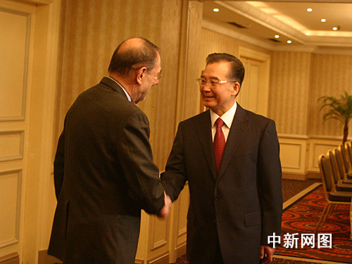 正在這里對歐盟總部進行正式訪問的中國總理溫家寶,當(dāng)?shù)貢r間一月三十日上午在下榻飯店會見了歐盟理事會秘書長兼共同外交與安全政策高級代表索拉納(左)。雙方對中歐關(guān)系重要性均給予高度肯定。張朔 攝