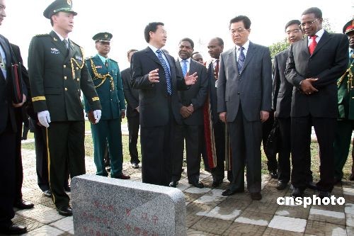 正在坦桑尼亞進(jìn)行國事訪問的中國國家主席胡錦濤,二月十五日在坦桑尼亞總統(tǒng)基奎特陪同下,專程前往位于首都達(dá)累斯薩拉姆市郊的中國援坦專家公墓憑吊。圖為胡錦濤主席在靳成威烈士的墓前久久佇立,他動情地說:“靳成威同志,我代表你的家屬來看你了!”中新社發(fā) 齊彬 攝