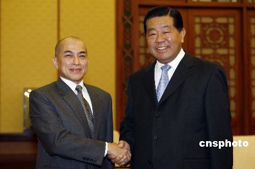 2月20日,全國(guó)政協(xié)主席賈慶林在北京人民大會(huì)堂會(huì)見(jiàn)了柬埔寨國(guó)王西哈莫尼。中新社發(fā) 盛佳鵬 攝