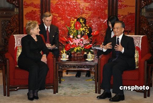 2月21日下午,中國(guó)國(guó)務(wù)院總理溫家寶在北京中南海紫光閣會(huì)見(jiàn)美國(guó)新任國(guó)務(wù)卿希拉里·克林頓。溫家寶在會(huì)見(jiàn)中引用《孫子兵法》中“同舟共濟(jì)”的成語(yǔ),比喻中美兩國(guó)關(guān)系。中新社發(fā) 任晨鳴 攝