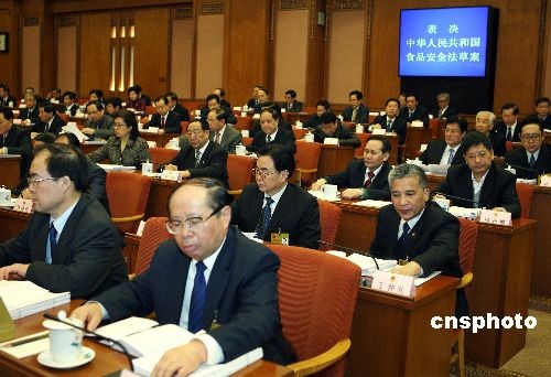 2月28日上午,十一屆全國(guó)人大常委會(huì)第七次會(huì)議在北京人民大會(huì)堂舉行閉幕會(huì),以158票贊成、3票反對(duì)、4票棄權(quán)通過(guò)倍受關(guān)注的《中華人民共和國(guó)食品安全法》。中新社發(fā) 任晨鳴 攝