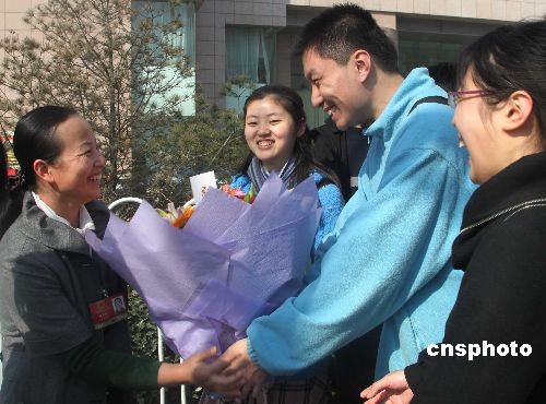 3月8日國際婦女節(jié),來自山東的全國人大代表、煙臺二中數(shù)學(xué)老師郝翠娟收到了在北京上大學(xué)的學(xué)生們送來的節(jié)日祝福。中新社發(fā) 張婭子 攝