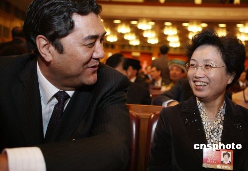 3月9日,十一屆全國人大二次會議第二次全體會議在北京人民大會堂舉行,剛剛利用大會休息日到天津考察鐵路建設的青海省女省長宋秀巖,向鄰坐的新疆維吾爾自治區(qū)政府主席努爾·白克力請教鐵路建設的經驗。中新社發(fā) 任晨鳴 攝