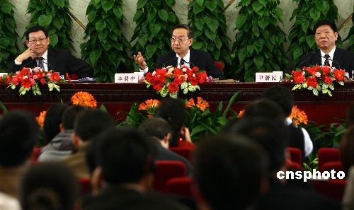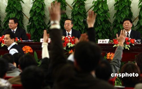 3月10日,十一屆全國(guó)人大二次會(huì)議在人民大會(huì)堂舉行記者會(huì),工業(yè)和信息化部部長(zhǎng)李毅中(中)、人力資源和社會(huì)保障部部長(zhǎng)尹蔚民(右)、商務(wù)部部長(zhǎng)陳德銘(左)就“擴(kuò)內(nèi)需、促就業(yè)、保增長(zhǎng)”答記者問。中新社發(fā) 杜洋 攝
