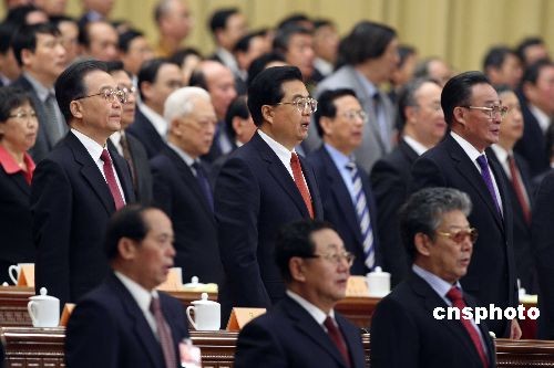 3月12日,全國(guó)政協(xié)十一屆二次會(huì)議舉行閉幕大會(huì),胡錦濤、吳邦國(guó)、溫家寶等黨和國(guó)家領(lǐng)導(dǎo)人在閉幕式上唱國(guó)歌。中新社發(fā) 盛佳鵬 攝