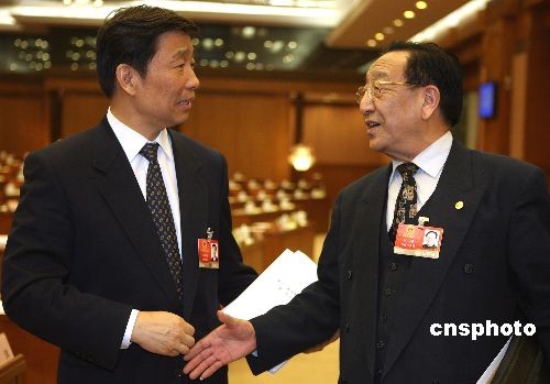 3月12日上午,十一屆全國(guó)人大二次會(huì)議第三次主席團(tuán)會(huì)議在北京人民大會(huì)堂舉行。會(huì)議經(jīng)過(guò)表決,決定將關(guān)于全國(guó)人大常委會(huì)工作報(bào)告的決議草案、關(guān)于最高人民法院工作報(bào)告的決議草案、關(guān)于最高人民檢察院工作報(bào)告的決議草案提請(qǐng)各代表團(tuán)審議。主席團(tuán)成員李源潮(左)、列確(西藏自治區(qū)人大常委會(huì)主任)出席。中新社發(fā) 任晨鳴 攝