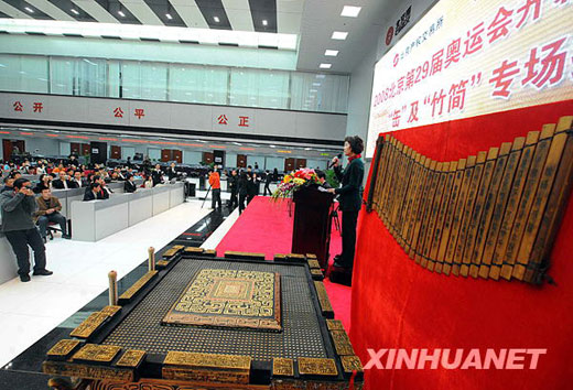3月18日,2008年北京奧運(yùn)會(huì)開幕式演出道具“缶”及“竹簡(jiǎn)”專場(chǎng)拍賣會(huì)在北京產(chǎn)權(quán)交易所進(jìn)行,這也是“缶”和“竹簡(jiǎn)”的最后一場(chǎng)專場(chǎng)拍賣。羅曉光 攝