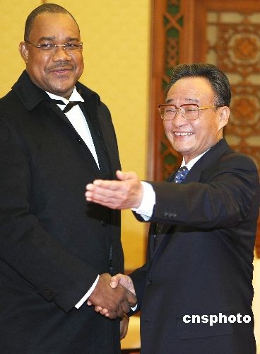 3月23日下午,中國(guó)全國(guó)人大常委會(huì)委員長(zhǎng)吳邦國(guó)在北京人民大會(huì)堂會(huì)見來訪的塞舌爾國(guó)民議會(huì)議長(zhǎng)帕特里克·赫米尼耶一行。中新社發(fā) 任晨鳴 攝