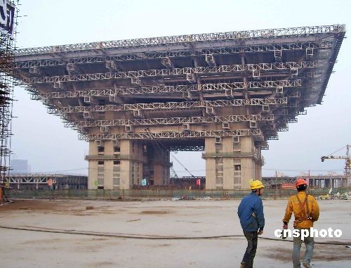 2009年3月25日消息,上海世博會場館建設正在有條不紊地進行。上海世博會執(zhí)委會副主任周漢民透露,中國館目前已經(jīng)封頂,今年年底建設將全部完成。中國館是上海世博會的標志性建筑,將永久地保存。中新社發(fā) 井韋 攝