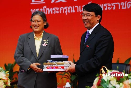 4月7日,泰王國瑪哈扎克里·詩琳通公主殿下和廈門大學(xué)黨委書記朱之文互贈禮品。當(dāng)日,瑪哈扎克里·詩琳通公主殿下出席廈門大學(xué)泰國文化節(jié)開幕式。此次廈門大學(xué)泰國文化是廈門大學(xué)建校88周年紀(jì)念的系列活動之一,旨在促進(jìn)中泰文化友好交流,敼死铩ぴ娏胀ü鞯钕略陂_幕式上用中文致辭,對中泰文化交流予以積極的肯定。中新社發(fā) 周運(yùn)杰 攝